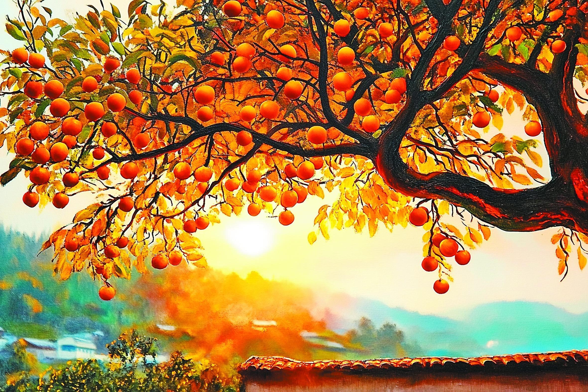 院子里,有母亲种的两棵柿子树。每年春天,在春日暖阳的照耀下,柿子树迸发出勃勃生机,抽出了新的枝条,长出了嫩绿的叶子,开满了星星点点的黄色小花。到了夏天,枝繁叶茂、青色的小柿子隐身其间。秋天,沉甸甸的硕果缀满了枝头,或独坠,或三五成群地聚在一起,宛如一盏盏红灯笼,在秋风中摇曳。不与桃李争春,不与百花争妍的柿子树,却成了秋日里的一道风景。唐代诗人李益的诗句“柿叶翻红霜景秋,碧天如水倚红楼”,则把这种情形描绘得惟妙惟肖。