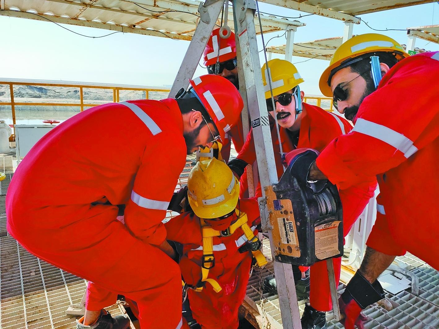 为了增加安全教育的直观性,SP-138队还利用施工间隙设置“实景课堂”,通过现场模拟的方式,分析发生吊装、受限空间事故的原因,开展应急救援演练,帮助员工增强安全意识和应急反应能力。“以动作代替语言,以现场实景代替室内学习,能更直观地加深大家对事故的认识,有效增强员工日常安全意识。”SP-138队司钻张延军说。