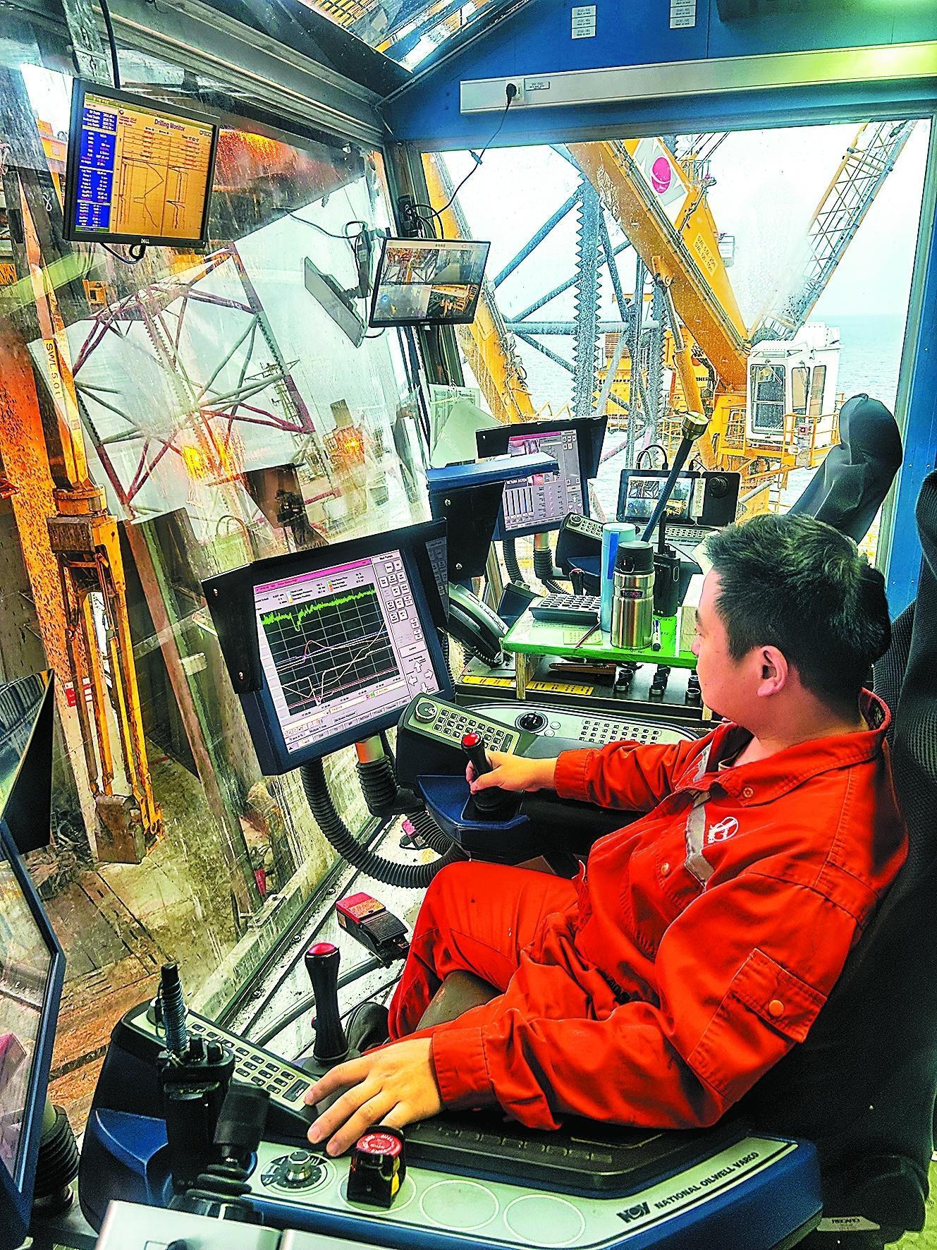 上海局勘探八号平台司钻控制顶驱进行钻井。李文磊 摄