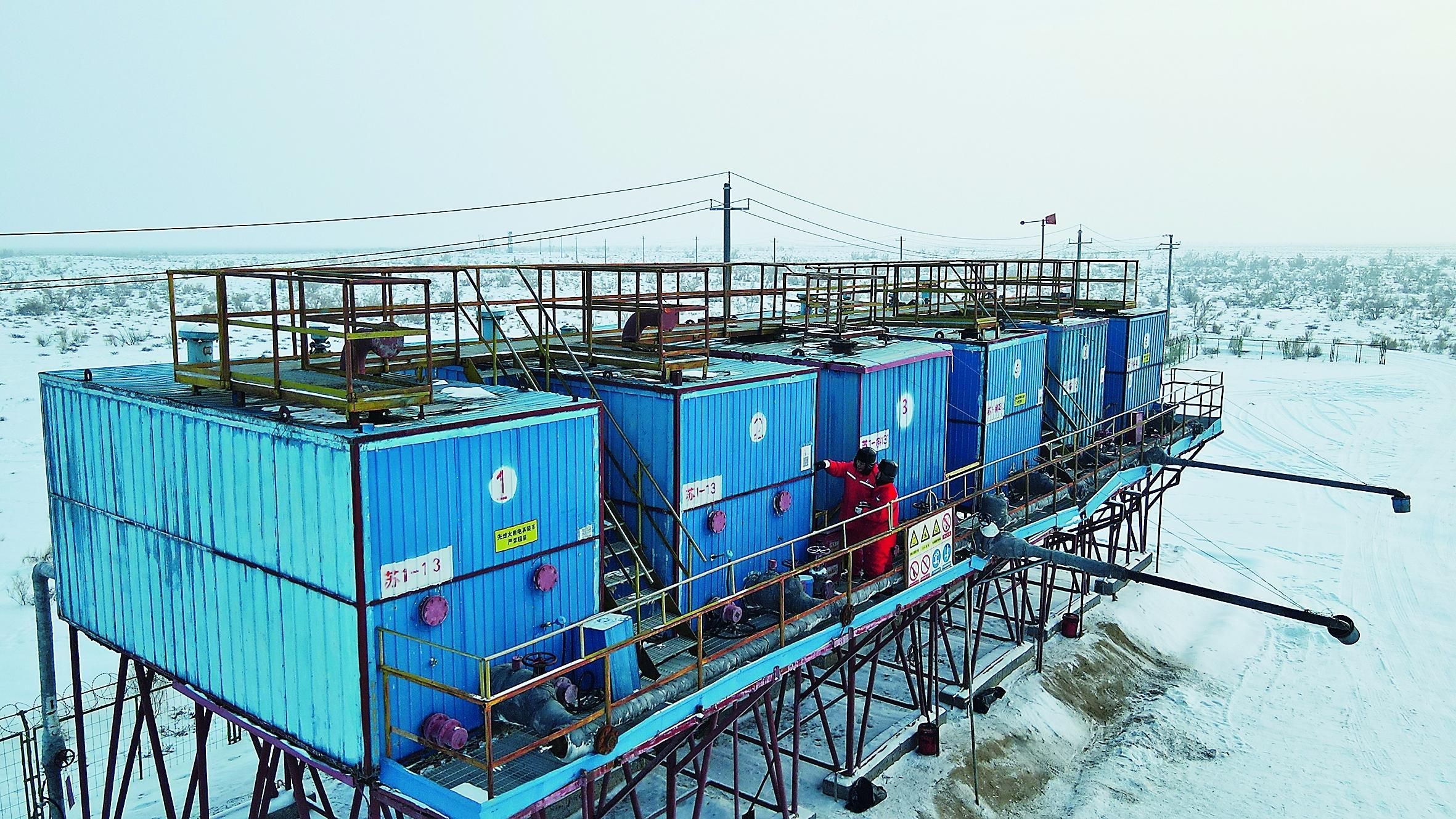 今天,恰逢苏13-平3井准备投产。刘长军他们要用最快的时间,将空旷的地面改造成一片工业“景观”:夯实地基、搭起平整井台,立上抽油机和油罐,还要安装上监控摄像头,24小时守护这片井场。