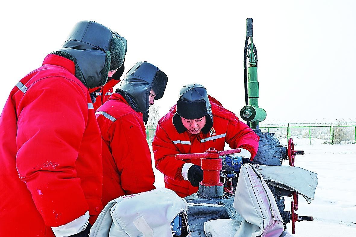 19时,落日余晖下,井站的轮廓在茫茫大雪的映衬下愈发分明,排10西站的员工仍未停下脚步。他们仔细检查着设备部件,保障油井开采工作不受影响,为能源保供奉献着力量。