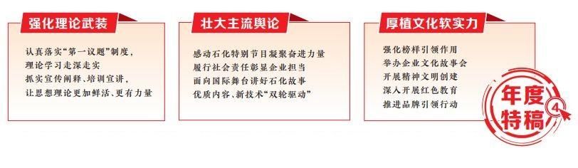这一年,中国石化宣传思想文化战线深入学习贯彻习近平文化思想,自觉担负起新时代新的文化使命,围绕中心、服务大局,守正创新、主动作为,发展壮大主流价值、主流舆论、主流文化,为加快推进高质量发展、谱写中国式现代化石化新篇章提供坚强思想保证、强大精神力量、有利文化条件。