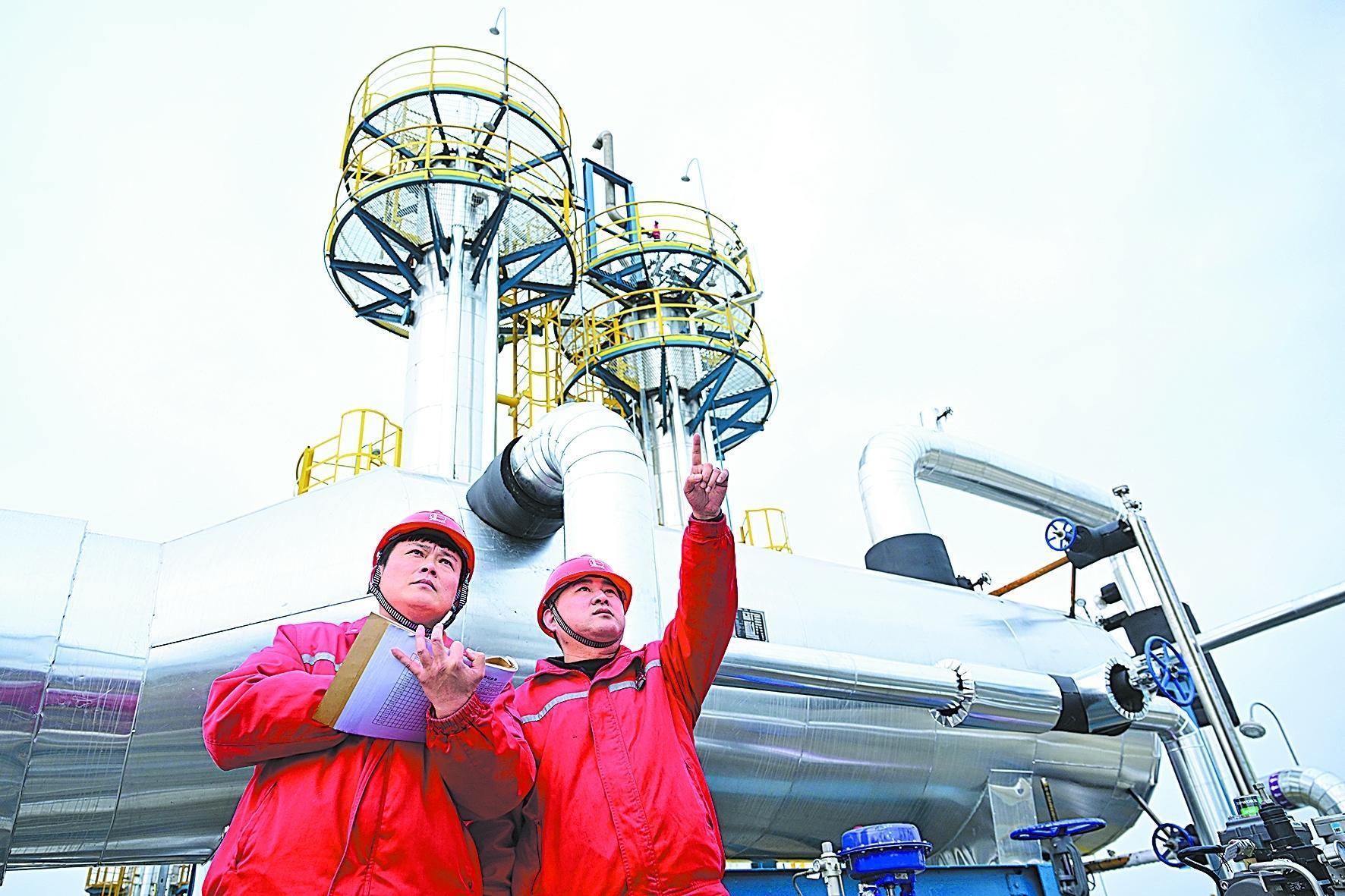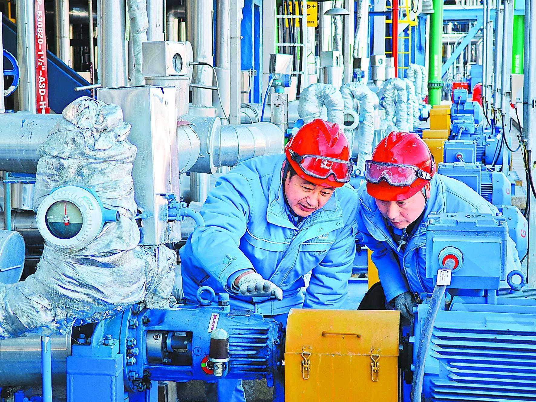 春节期间,华东油气分公司CCUS调峰中心针对寒潮天气和节日期间生产情况,构建“人工巡检+智能机器人+云平台监测”数智化管控体系,员工加强现场巡检,技术人员通过DCS系统实时监控关键设备运行参数,智能巡检机器人每小时自动巡检,确保调峰中心安全运行,有力保障中国石化首个页岩油二氧化碳驱提高采收率先导试验井组压驱所用液碳供应。图为CCUS调峰中心员工正在现场巡检。沈志军 摄 吴 珉 文