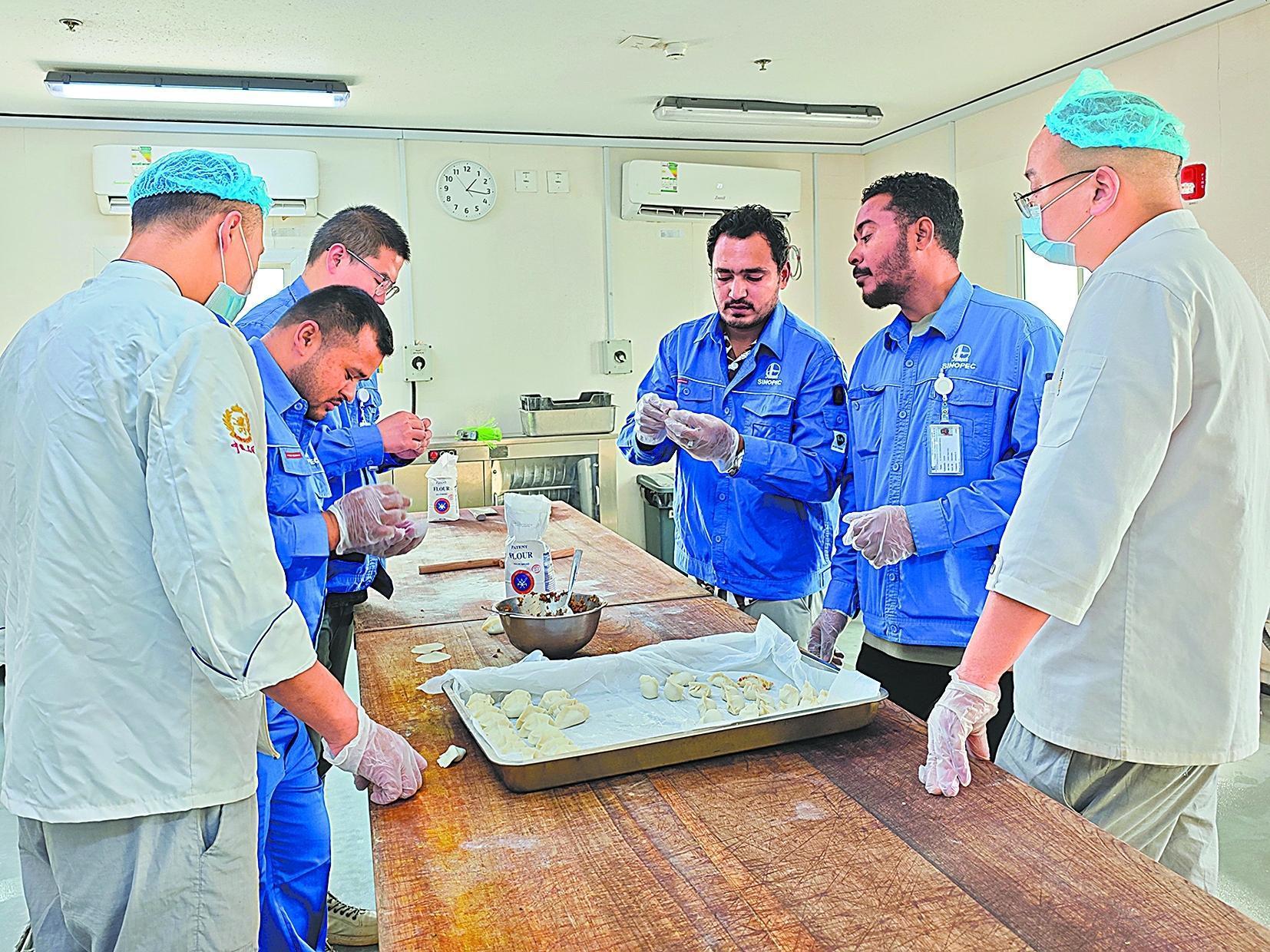 又是一年春节团圆时,五建公司沙特马赞天然气处理项目的中外员工共庆首个非遗春节。大家携手挂灯笼、贴春联、包饺子,用双手传递着节日的喜悦,用红火喜庆的装饰点亮异国营地。在温馨的团拜会上,员工们互致最诚挚的新春祝福,在欢乐祥和的氛围中期盼新的一年再创佳绩。图为该项目的中外员工一同包饺子。
