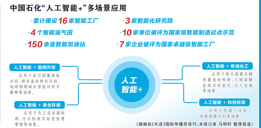 以大模型技术为代表的新一代人工智能正加速实现从辅助脑力向替代脑力的角色转变,通过人工智能与石油石化业务场景深度融合,将为石油化工全链条、生产经营管理各领域带来全方位变革。中国石化在多领域开拓“人工智能+”应用场景,梳理了勘探、开发、炼油、化工、安全、环保、科研、经营、管理等9类200余项人工智能场景。多家单位积极探索人工智能发展,试点建设油井工况智能诊断、电镜图像识别、火焰识别、智能仓储、机器人操作等分散场景并取得初步成效。