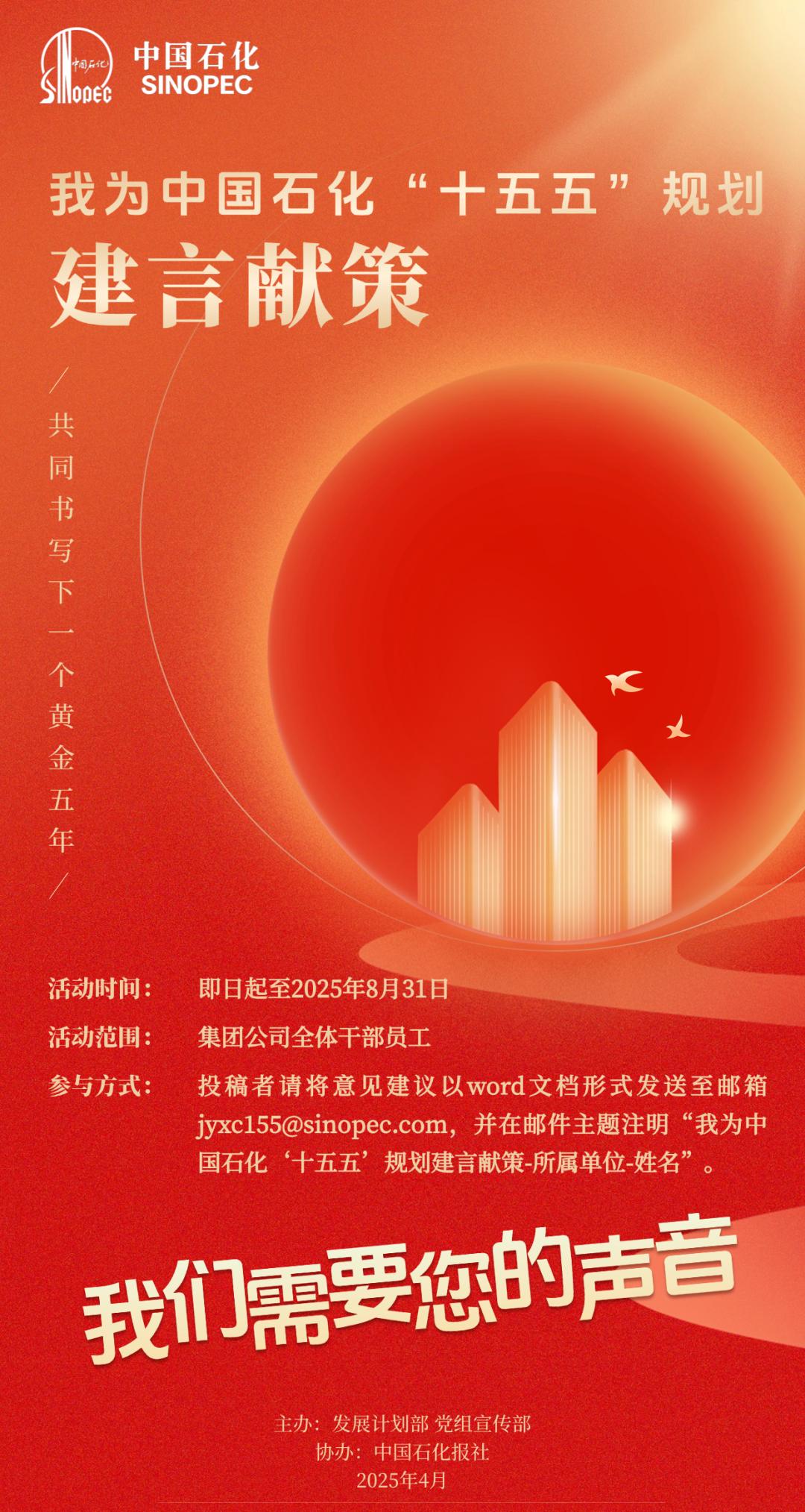 为科学编制中国石化“十五五”规划,更好地把社会期盼、群众智慧、专家意见、基层经验充分吸收到规划中,努力使广大干部员工的“金点子”转化为推动集团公司“十五五”发展的新举措,现在全系统范围内开展“我为中国石化‘十五五’规划建言献策”活动。
