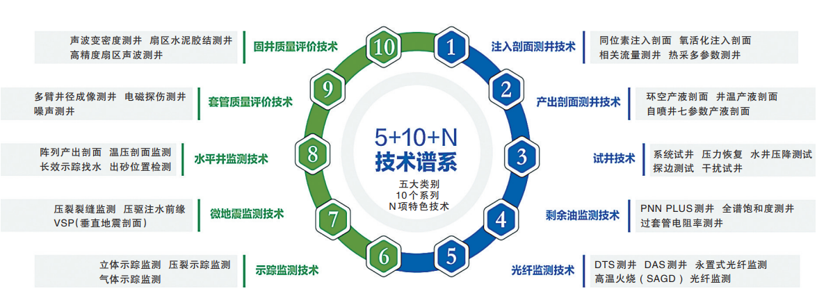主要包括注入剖面测井、产出剖面测井、储层参数测井及工程测井四大类型技术。其中,注入剖面测井主要包括采用放射性同位素示踪、井温、流量(氧活化/电磁流量/相关流量)组合测井方式;产出剖面测井可测量井筒流体产出流量、持水率、持气率等关键参数,在水平井测井方面采用阵列式成像技术提高测试精度;储层参数测井传统以脉冲中子法为主,包括碳氧比、PNN(脉冲中子-中子测井技术)等技术,近些年诞生了过套管电阻率测井技术,突破套管电阻率测量禁区,以非放射性方式为储层参数评价提供了新的手段;工程测井包括井筒完整性评价及陀螺定向等,测井技术多样,电磁探伤技术可实现多层套管同步检测,光纤传感技术可实现连续监测,再利用大数据评价油气田开发效果,为智慧油田建设提供了有力数据支撑。