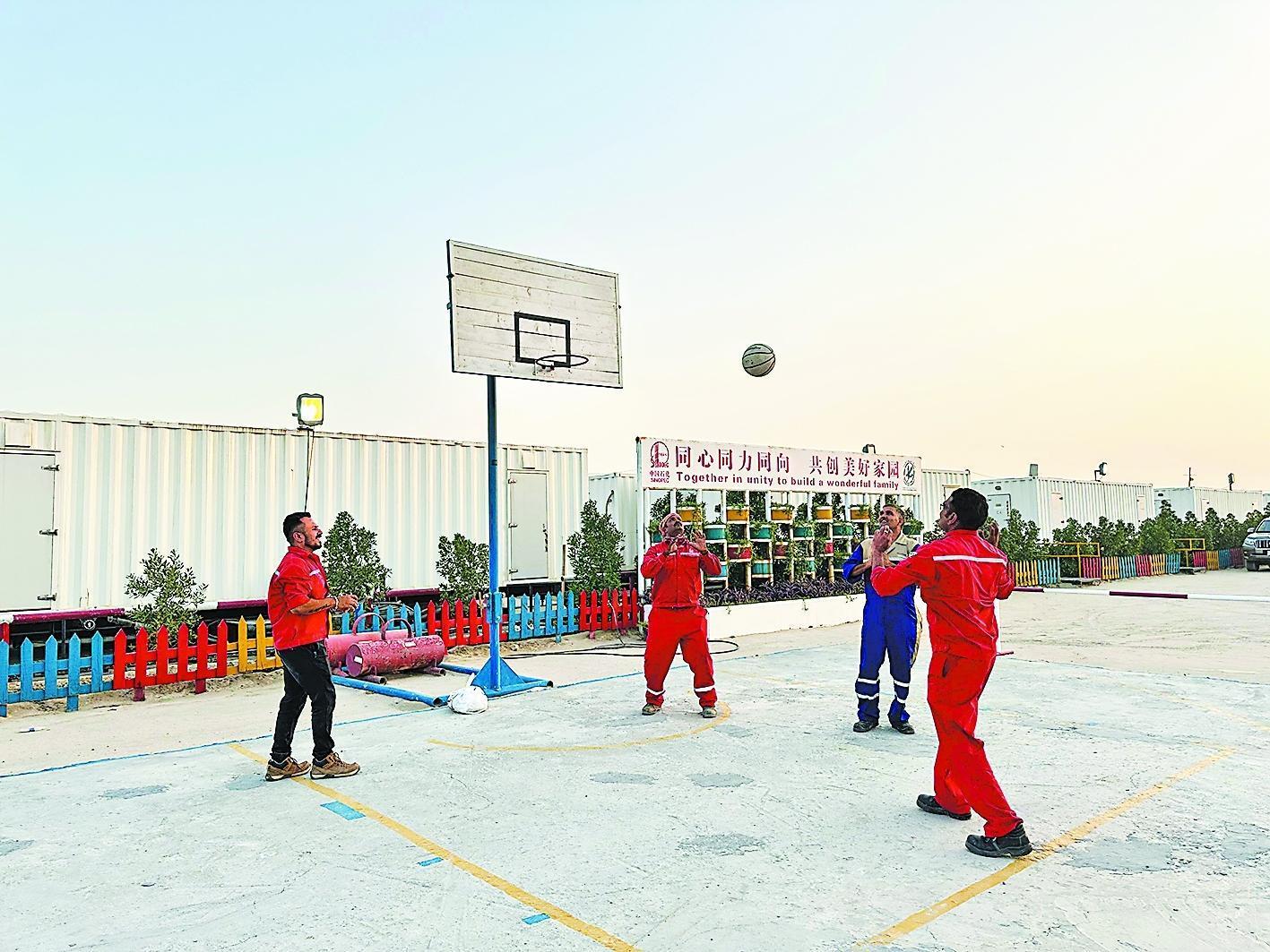 篮球是全世界无数人喜爱的运动,为了满足大家的运动娱乐需求,项目部在营地上搭建了一个篮球场。工作之余,篮球爱好者们经常聚在一起感受运动带来的快乐。