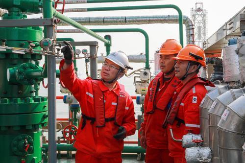 随着夏季气温上升,海上平台生产设备的故障率也随之增加。胜利油田海洋采油厂海四采油管理区党总支发挥“关键少数”示范引领作用,组织党员干部梳理风险点,并利用出海期间对海上平台进行全方位、立体化风险隐患排查,确保平台油气生产设备设施安全平稳运行。图为6月9日,该区党总支副书记强乐乐(左一)带领党员排查井控安全隐患。张 灿 摄