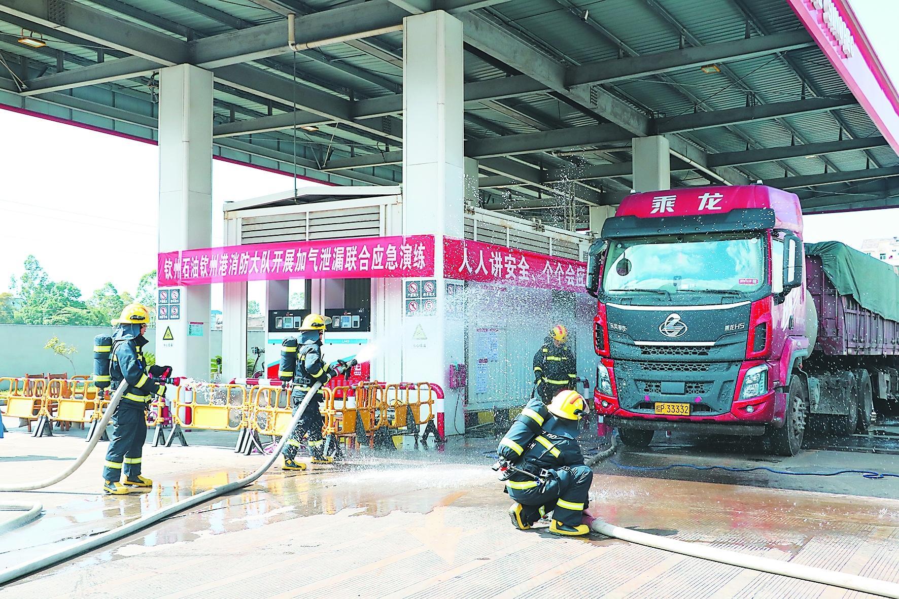 广西石油深入开展“安全生产月”活动,严格落实岗位责任制,按照基层库站设备消防安全管理要求,组织开展应急演练,强化基层库站安全意识,提升政企联合应急处置能力。图为近日广西石油联合地方消防大队在钦州蓬莱加能站开展应急演练。刘大敏 摄 翟恒芳 文