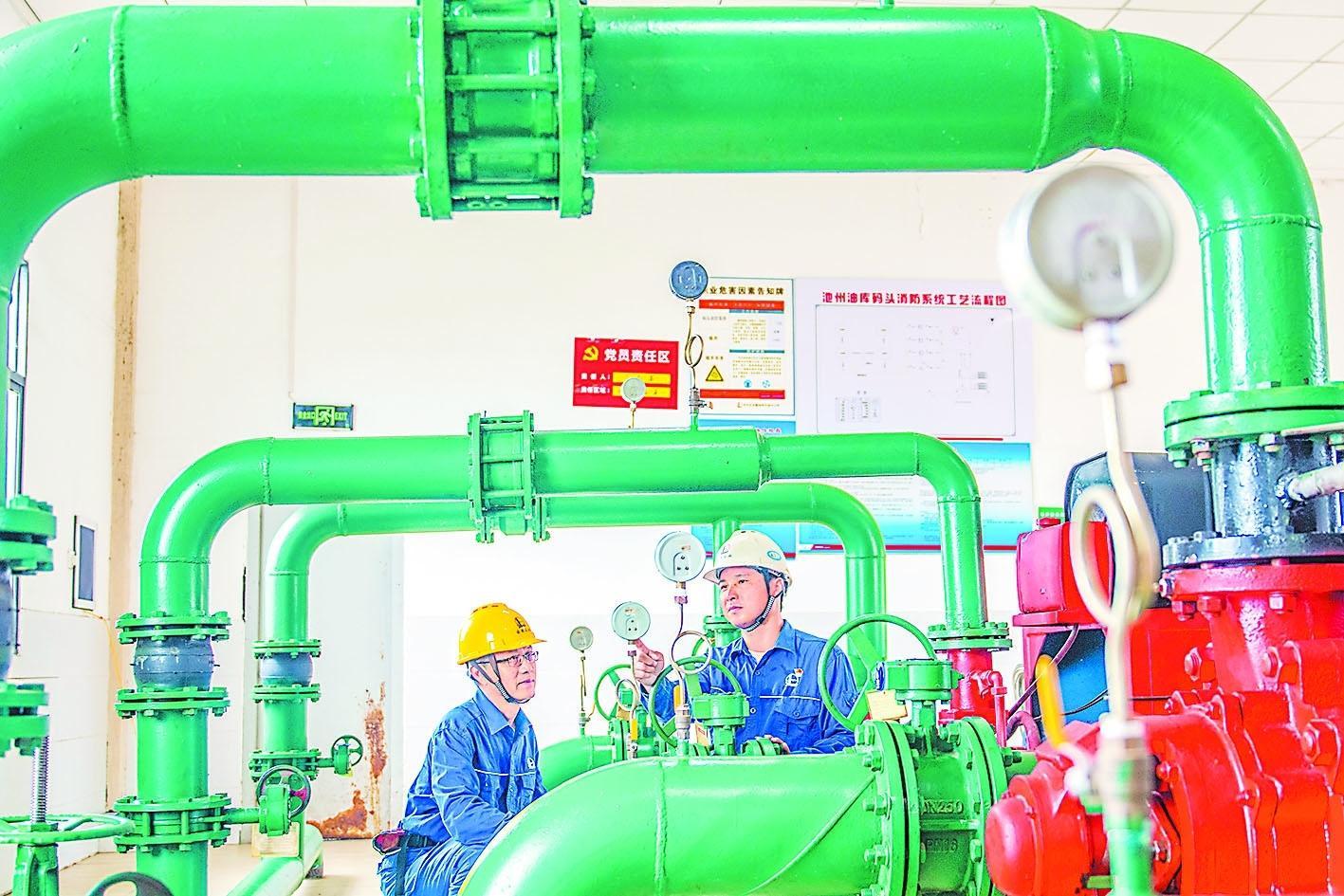为应对夏季高温、暴雨等极端天气带来的安全生产风险,安徽池州石油构建“网格化+动态化”巡查体系,优化班组人员配置,加密巡检频次,做好储罐、消防设施等关键设备维护。图为6月30日安徽池州石油油库员工对消防设备进行精细巡检。孙宗奎 摄