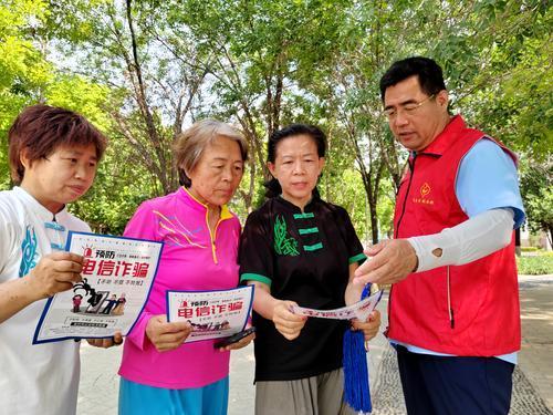近日,胜利油田老年服务管理中心滨南老年服务部志愿者走进社区,积极开展防诈骗宣传活动。图为7月7日,志愿者发放“预防电信诈骗”宣传页,向居民讲解防范知识,增强防骗意识。肖金禄 摄 路贻霞 文