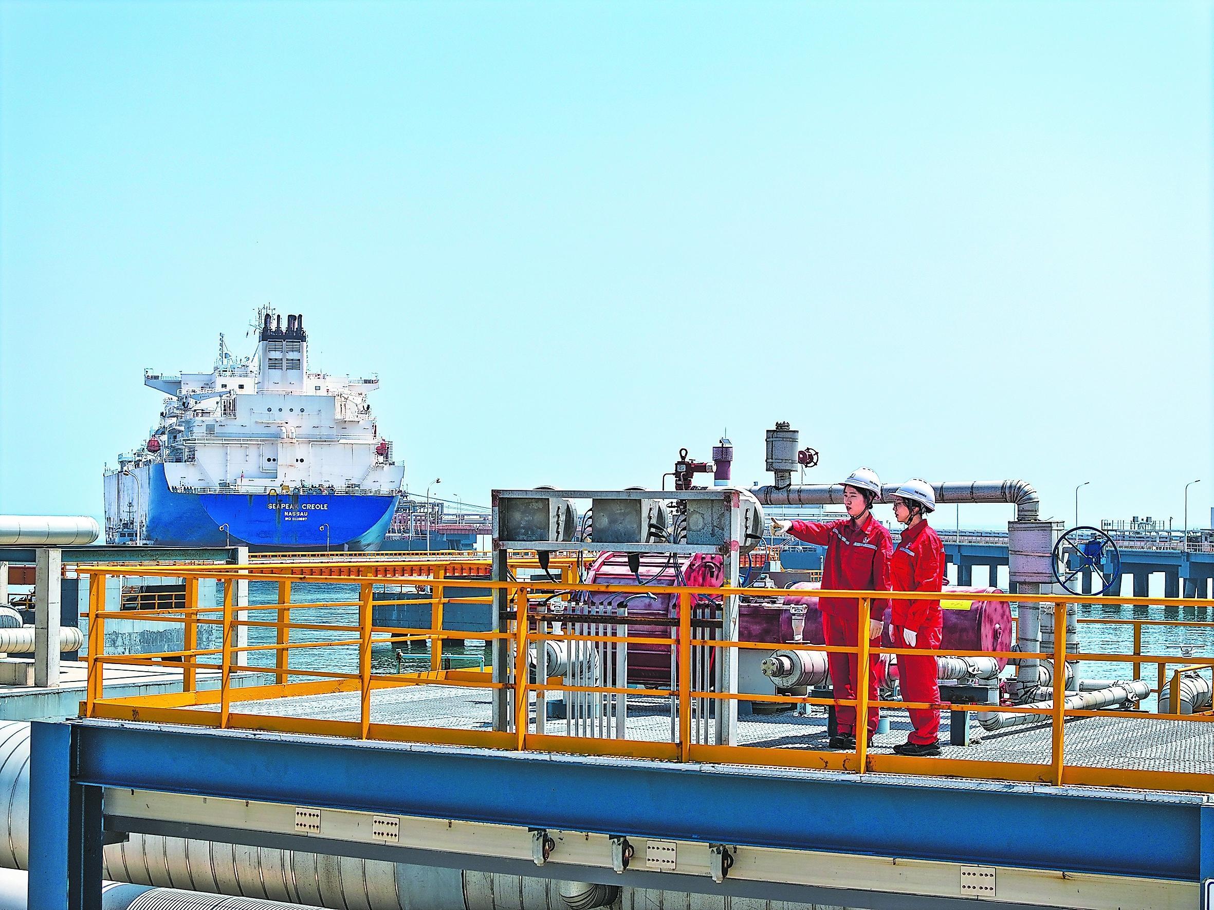 入夏以来,天然气分公司天津LNG接收站持续强化资源统筹,优化LNG船舶接卸措施,密切关注船舶状态、卸载进度、外输管线等重点,做好设备设施维护。6月以来,外输天然气超4亿立方米、槽车充装量同比增长75%,为华北地区迎峰度夏提供有力支撑。图为近日工作人员在天津LNG接收站码头巡检。王军 摄 王卓然 文