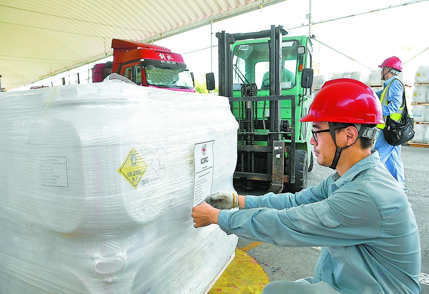 7月17日,江汉盐化工向国际红十字会发出今年首批236.88吨“SINOPEC”牌漂粉精产品。10年来,该公司先后8次中标国际红十字会相关订单,累计供应高效消毒剂产品1.2万吨。今年初在其供应商履约情况年度评估中,江汉盐化工获得19.1分(总分20分)的高分。图为江汉盐化工员工检查产品包装。宋国梁 摄 黄红霞 文