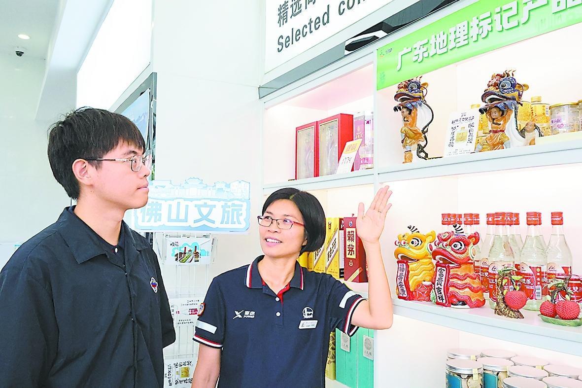 凤凰岗加能站毗邻公园和夜市,晚上,一些在公园散步和逛完夜市的游客会顺便来加能站喝杯咖啡或饮料。该站在易捷便利店特别设置了广东地理标记产品专区,精选多款具有代表性的特色产品,如石湾玉冰烧、九江双蒸、新会陈皮、英红九号红茶等,并制作产品“明信片”,把产品特点、使用方式浓缩在卡片上,以便游客了解。此外,该站还摆放了岭南剪纸、醒狮陶瓷摆件等传统文化艺术品,将佛山独特的文化元素融入购物环境,让游客感受到浓厚的文化氛围。