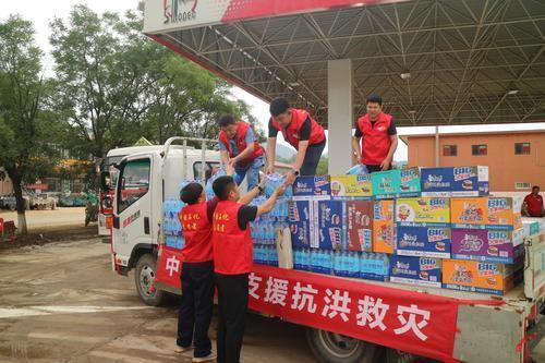 洪水退去后,河北承德石油组织志愿者在兴隆县区域经营部六道河加能站发放救灾物资。 文 静 摄