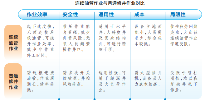 相比普通修井作业,连续油管作业优势显著:作业效率更高,起下速度快,无须频繁连接单根油管,大幅减少停工时间;安全性更强,带压作业能力突出,能降低井喷风险,且无须人员频繁操作井口;适用性更广,能适用于水平井、大斜度井及复杂结构井,可进行精细干预;综合成本更低,设备占地面积小,所需人员少,能有效控制作业成本。