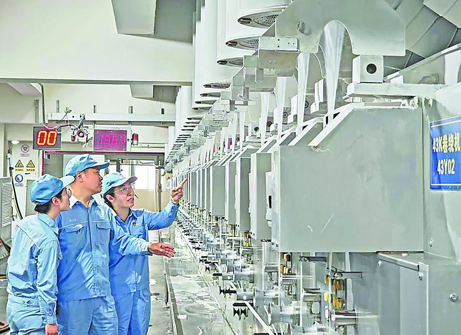 仪征化纤员工在生产现场查看涤纶短纤生产过程中产品质量。刘玉福 摄