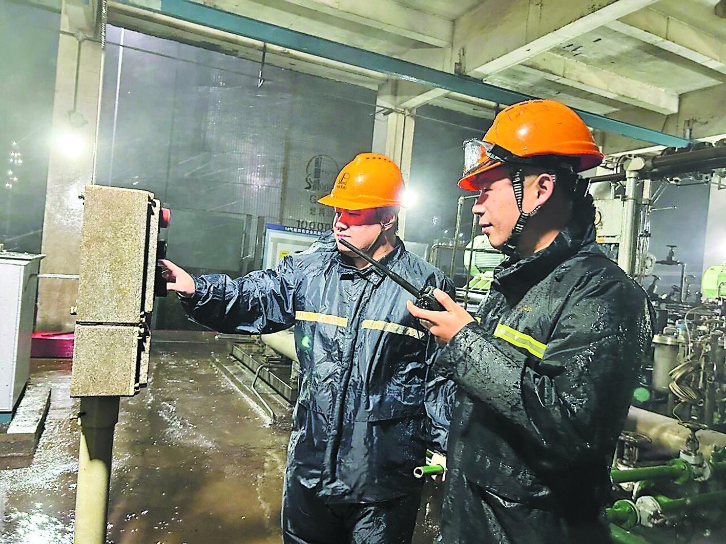 10月5日,强台风“麦德姆”登陆广东湛江。中科炼化的干部员工逆风而行,全力守护装置平稳生产。图为10月5日晚,炼油四部员工在加氢区域维护设备运行。黄 梅 摄 吴金梅 文