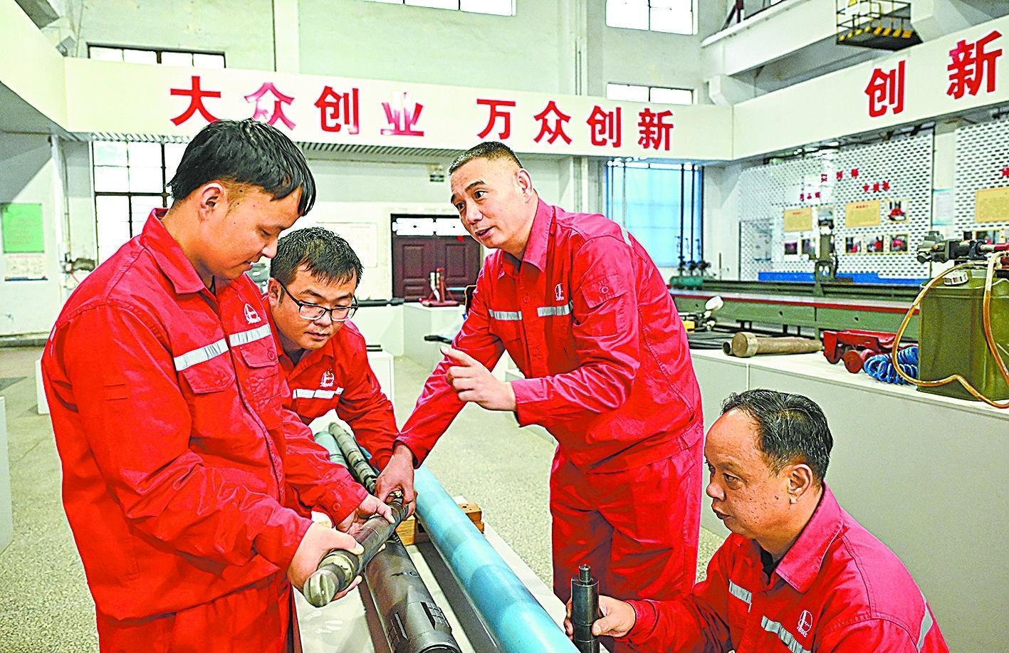 10月5日,在中原油田采油气工程服务中心创新工作室,集团公司技能大师、感动石化人物杨相杰(右二)带领三位徒弟开展技术创新。从图纸到计算,再到反复调试,杨相杰耐心指导徒弟们稳步操作。双节假期,他们将对祖国的祝福、岗位的热爱,凝聚在持续攻关创新中。胡庆明 摄孙 博 文