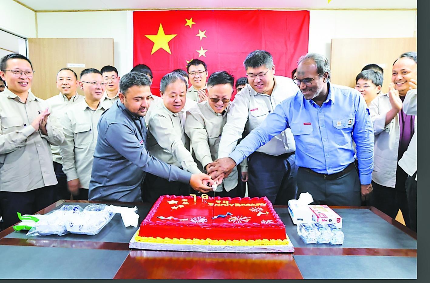 10月1日,石油工程建设公司沙特MGS项目传来捷报——该项目9月焊接里程超63公里,创单月焊接新纪录,为祖国献上了一份厚重的“钢铁贺礼”。图为项目中外工作人员欢聚一堂,共庆佳节。杨 韦 摄