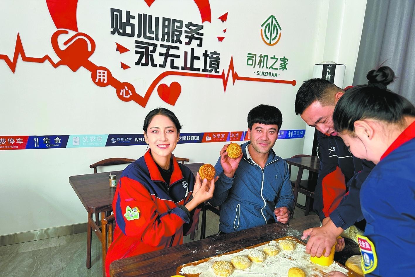 月满中秋迎团圆。新疆和田石油洛浦工业园区加能站“司机之家”里,员工与长途司机一同制作月饼,喜迎佳节。毛 杰 摄 李亚云 文