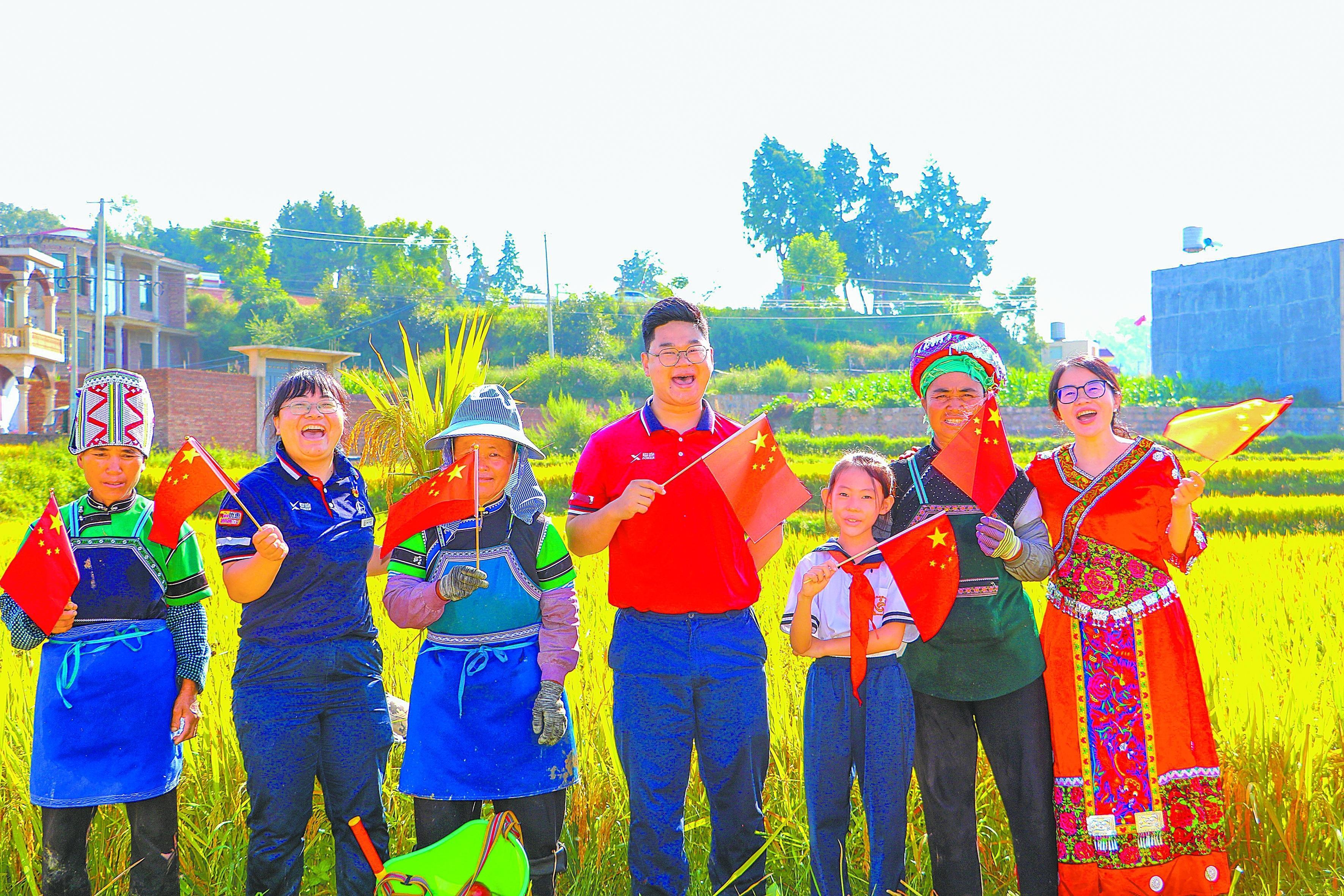 国庆中秋假期,云南文山石油员工走进当地彝族村落,挽起衣袖、俯身稻田,与农户共挥镰刀收割希望。在丰收的田野上,大家挥动五星红旗,祝福祖国繁荣富强,祝愿生活幸福美满。蔡艳玲 摄 代泽万 文