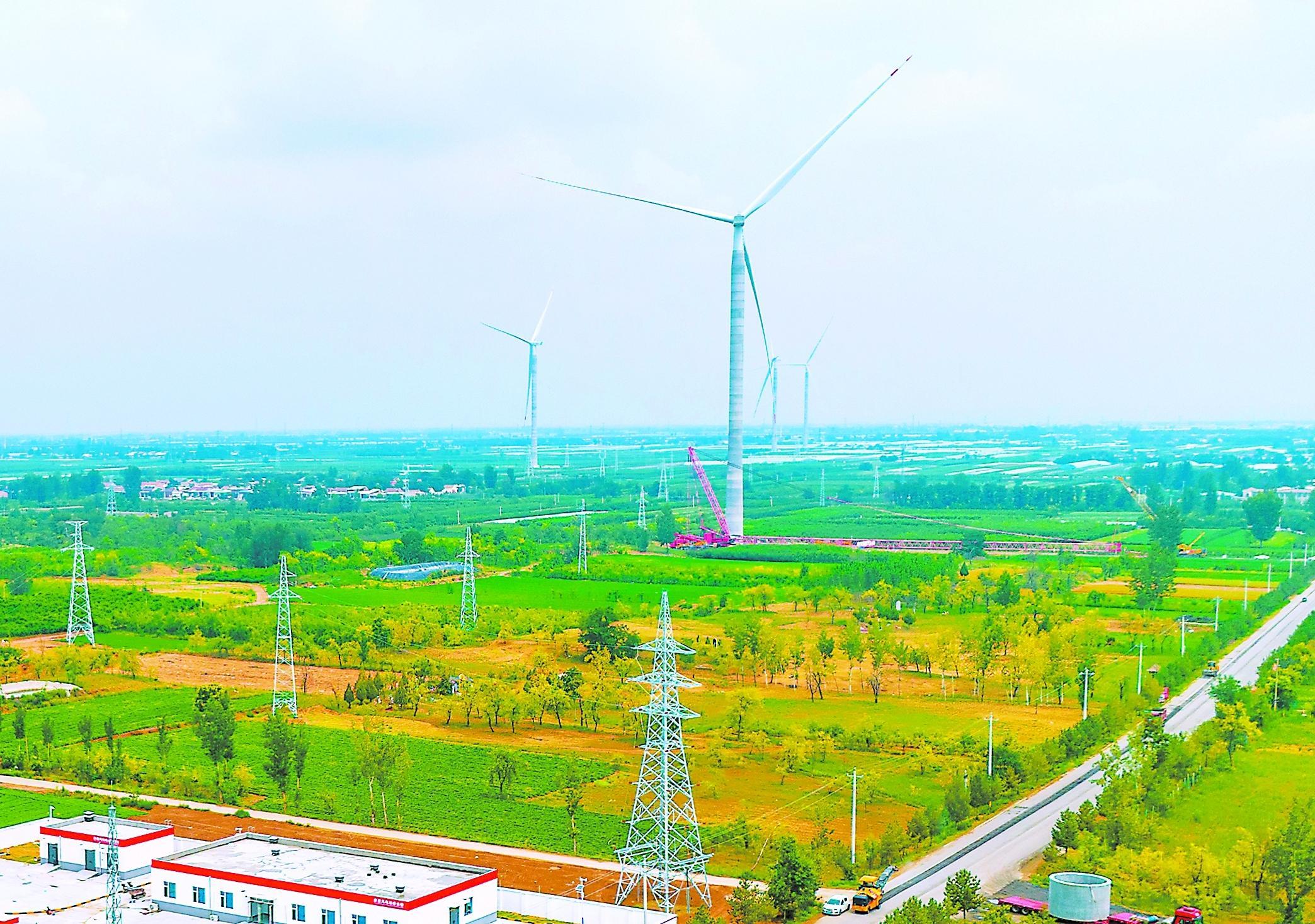 10月12日,新星公司大荔50兆瓦风电项目完成全部风机吊装,进入全容量并网发电冲刺阶段。该项目位于陕西省渭南市,首台风机于5月31日并网发电,截至目前已并网30兆瓦。这是中国石化首个采用混塔结构的风电项目,由起运公司负责风机吊装,风机齿轮箱油采用长城润滑油,实现了关键耗材国产化。图为项目风机吊装现场。