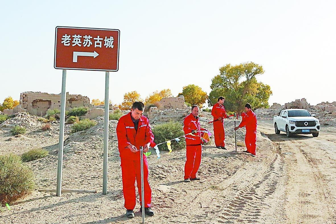 为保护新疆老英苏古城,地球物理公司SGC2113队队员在古城周围拉上警戒线。王跃辉 摄