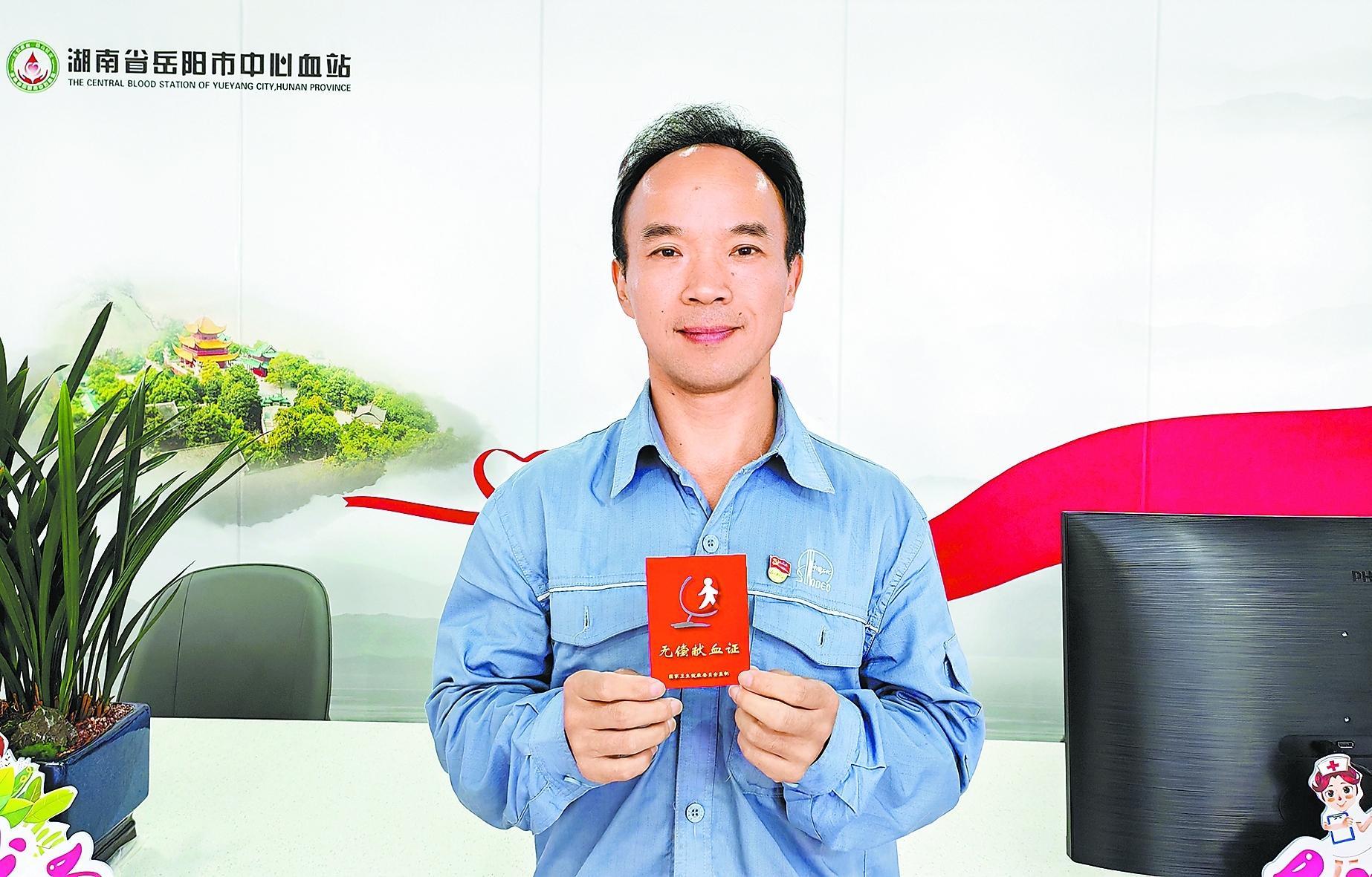 2023年农历大年初三,正在老家陪父母过春节的曾北岳,突然接到岳阳市中心血站的求助电话:“医疗用血严重告急!”接到电话后,他立即搭乘客车赶往115公里外的市区,毫不犹豫捐献400毫升成分血。