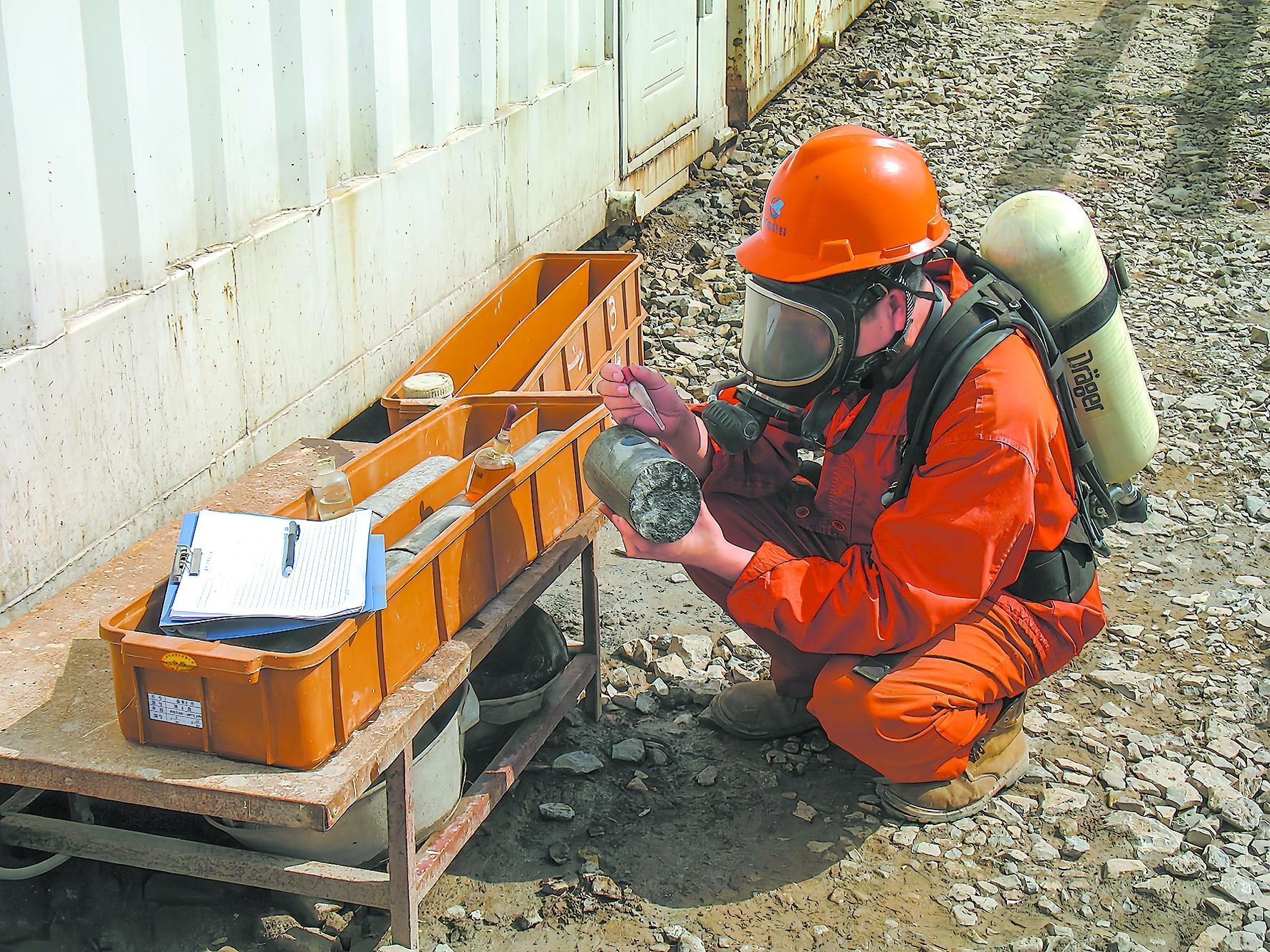 图1:普光8井现场,胜利油田地质录井公司(经纬公司胜利地质录井公司前身)SL202录井队队员在岩芯出筒时,背着空呼描述岩芯。