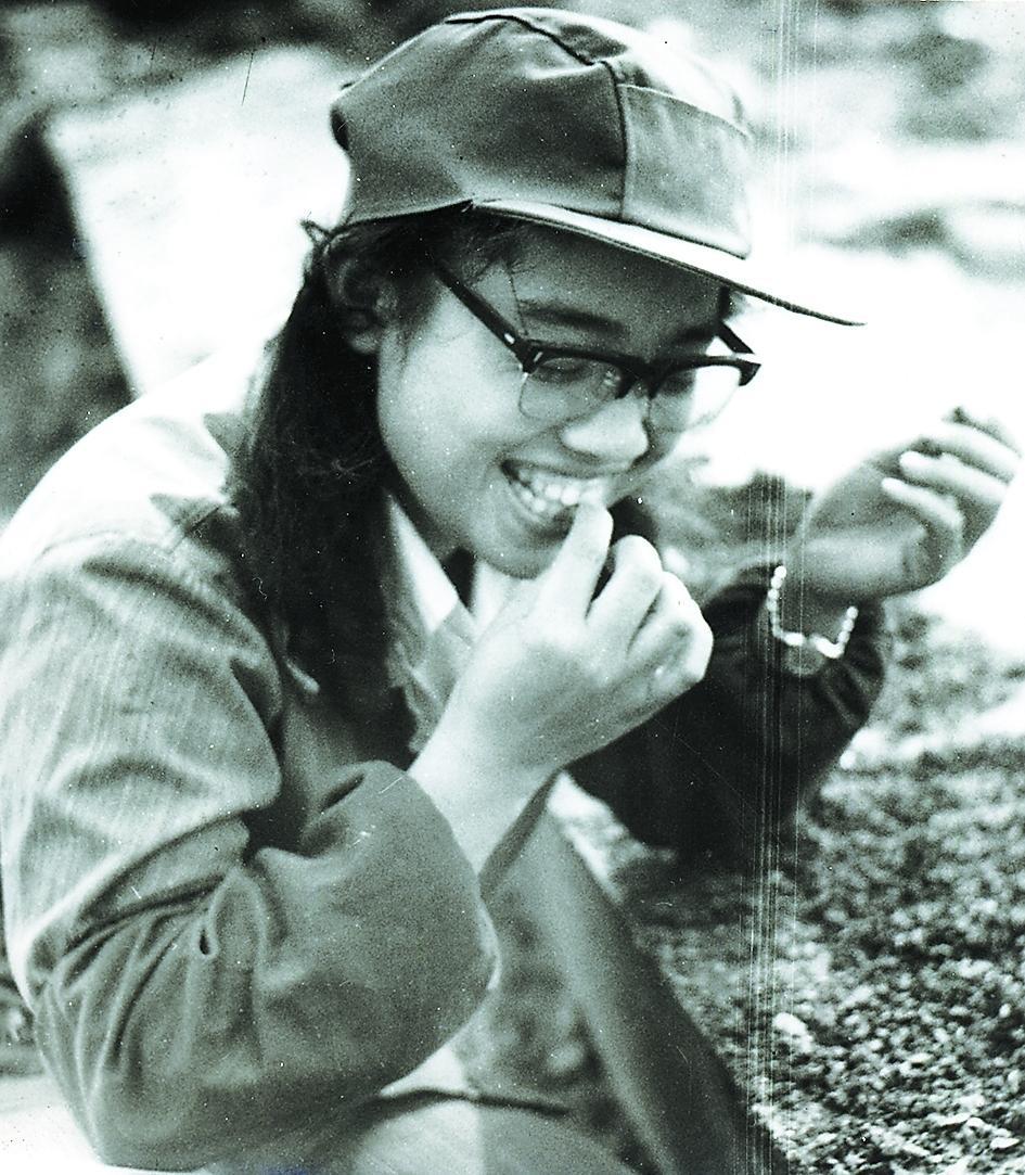 在众多的老照片中,有一张黑白照特别引人注目,一名戴眼镜的女录井队员用牙轻咬着一粒油砂,笑容灿烂,似乎品尝到了油气的味道。