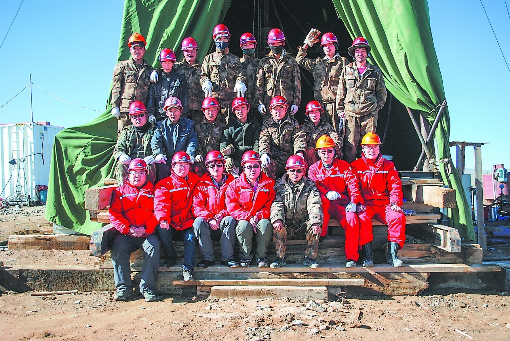 图2:2016年8月,西藏羌塘QK-7井开钻前,胜利油田地质录井公司SL293录井队同西藏地质矿产勘查开发局地质大队在井架前合影留念。