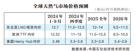 尽管前三个季度供应相对充足,但受冬季气温偏冷、美俄和中东紧张局势升级等因素影响,气价持续在偏高位置波动。三季度后,受亚洲需求偏弱影响,欧亚气价环比和同比均下行。1~9月,JKM(普氏日韩标杆天然气价格指数)均价为12.70美元/百万英热单位,同比上涨1.5美元/百万英热单位;欧亚市场价格趋势基本一致,但受春季后库存容量偏低、进口LNG大幅增加影响,欧洲市场价格同比涨幅更大。1~9月,TTF(荷兰产权转让设施天然气价格指数)均价为12.52美元/百万英热单位,同比上涨2.42美元/百万英热单位。美国主要受原料气需求增长推动,1~9月,HH(纽约亨利中心天然气价格指数)均价为3.48美元/百万英热单位,同比上涨1.26美元/百万英热单位。