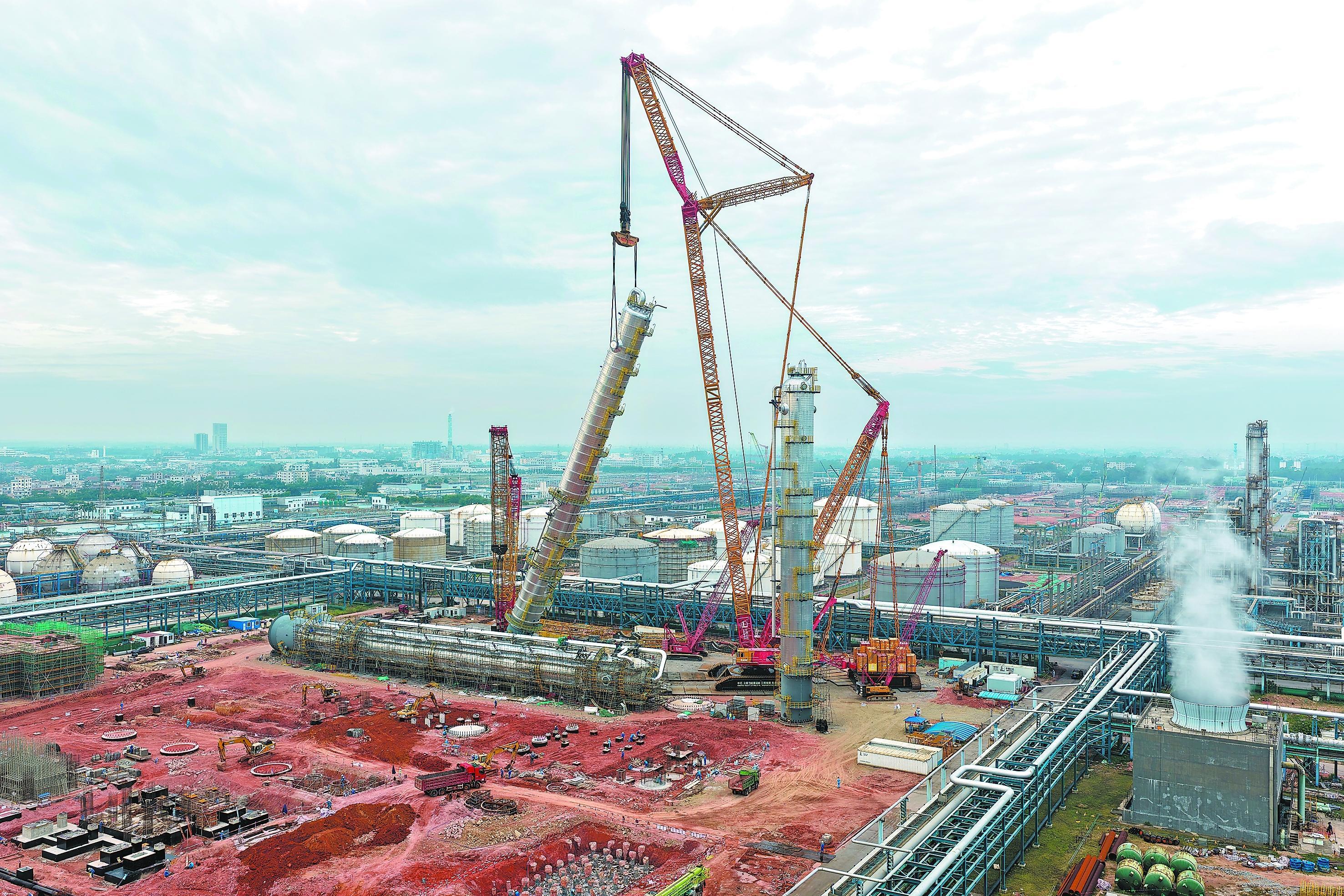 10月29日,茂名石化升级改造项目100万吨/年3号裂解装置乙烯塔精准吊装就位。该塔体直径6米、高94.75米,起吊重量近1000吨。面对老厂区改造条件受限、现场作业空间狭窄等挑战,茂名石化协同项目管理公司,组织工程建设公司、十建公司、起运公司等单位,对吊装方案开展多轮推演,优化各项操作细节,采用“主吊+溜尾”双机协同方式,精准完成设备起升、负重直行、高位跨越,实现设备平稳落位。图为吊装现场。