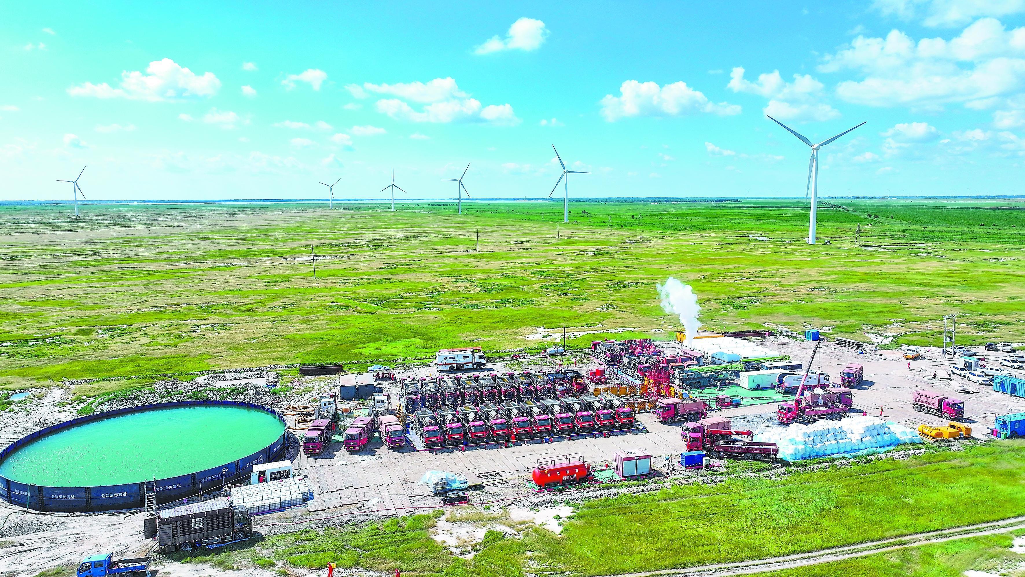 压裂施工是火山岩油气藏高效开发的关键一环。东北工区火山岩气藏储层埋深超4000米,渗透率极低,属超低渗致密储层。面对压裂施工“压不开、加不进、撑不住”等难题,他们全力推进核心技术攻关,采用二氧化碳泡沫压裂技术,抑制压裂液向天然裂缝过早滤失,有效压开储层,配合复合粒径支撑剂,实现多尺度裂缝的高效支撑,支撑后导流能力提升40%以上。实施“造长缝+体积改造”策略,结合“双暂堵”技术,改造体积(SRV)平均提升35%,实现“由线及面”的立体改造。全面推广二氧化碳多元复合压裂技术,实现“扩孔增渗”,显著改善储层物性,同时有效解除水锁伤害, 畅通气体渗流通道,见气周期缩短25.5%,加快产能释放。复合压裂技术先后在查干花、聚宝山等区块规模应用66井次,与同区域常规压裂井对比,单井平均产量提升33.8%。