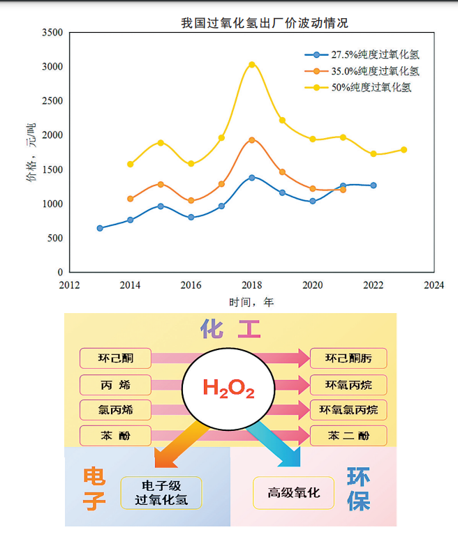 除了2018年因国内装置开工率不足导致的过氧化氢价格短期上涨,我国过氧化氢市场长期保持较为稳定的运行态势,产品整体价格波动差稳定在500~600元/吨,其中纯度27.5%的过氧化氢出厂价750~1250元/吨,纯度35%的过氧化氢出厂价1100~1480元/吨、纯度50%的过氧化氢出厂价1750~2200元/吨。
