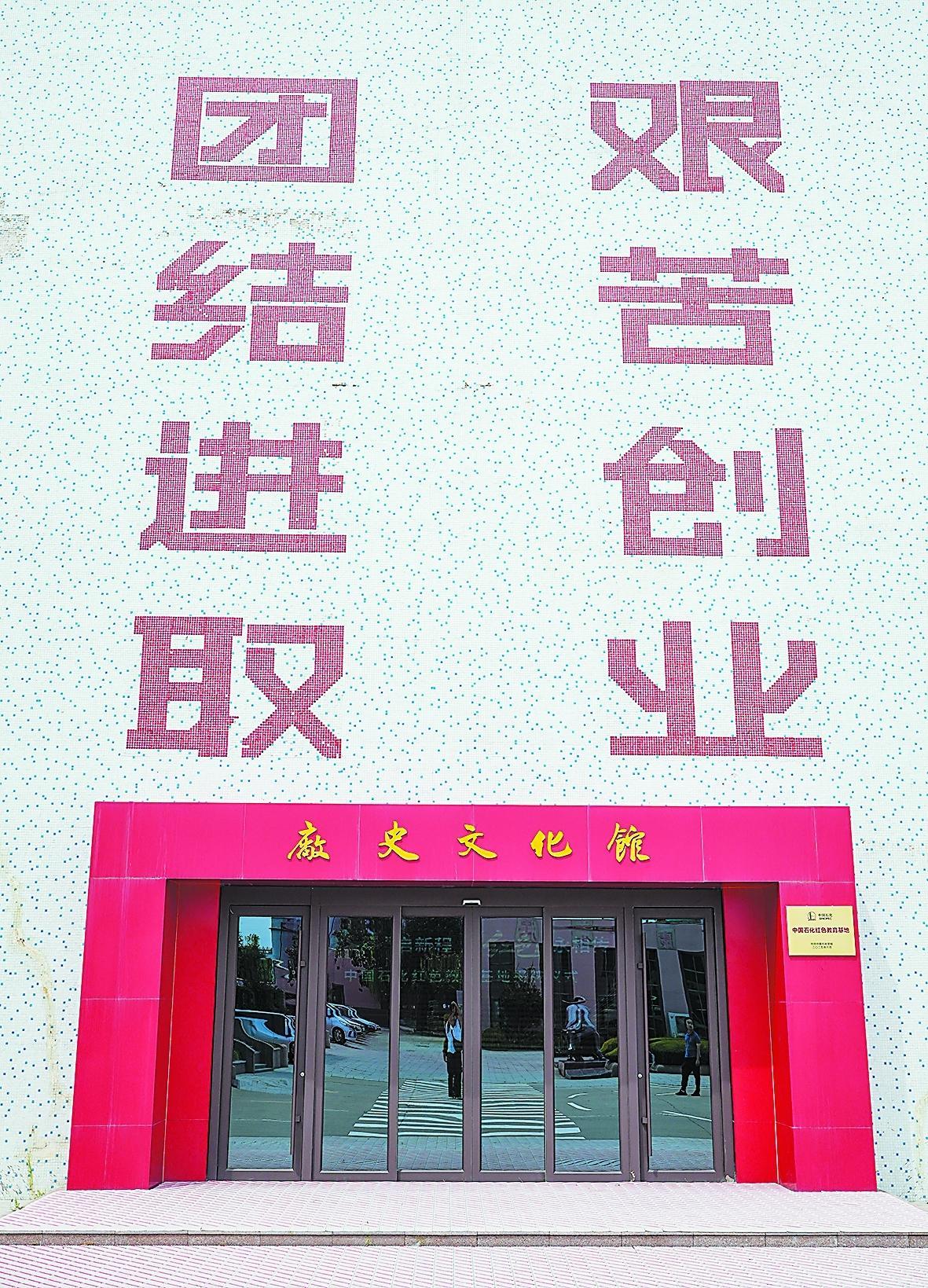 这座建筑最初是青岛石化刚建厂时的机加工厂房,如今被改造成红色教育基地,外墙上依然保留着“艰苦创业、团结进取”8个大字。它见证了青岛石化在胶州湾畔的这片荒滩上,从无到有不断发展壮大,负笈追梦、艰苦创业的奋斗史。60多年来,青岛石化始终听党话、跟党走,牢记嘱托、感恩奋进,将一代又一代青岛石化人厚积而成的“责任、进取、务实、奉献”企业精神发扬光大。