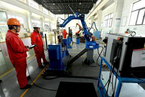中原石油工程公司管具公司今年4月引入智能焊接机器人,助推钻头制造自动化、精细化升级,半年来产能同比提升20%,钻头焊接精度达微米级。截至目前,该公司金刚石钻头销售额同比增加475万元,多款钻头在中原油田、西北油田、川西气田等市场创进尺新高,同时销往哈萨克斯坦等海外市场。图为11月12日该公司员工操控智能焊接机器人焊接钻头钢体。赵奕松 摄 于德伟 文