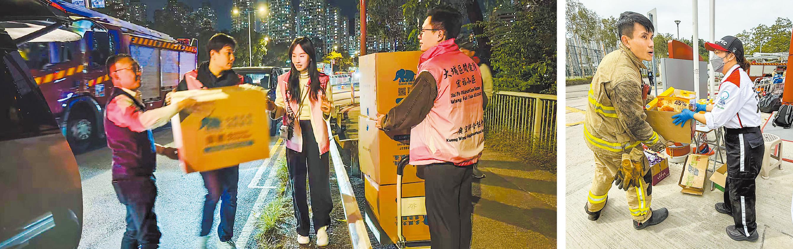 右图:11月26日,中国石化员工向火灾救援人员赠送食品等物资。刘昱琦 供图