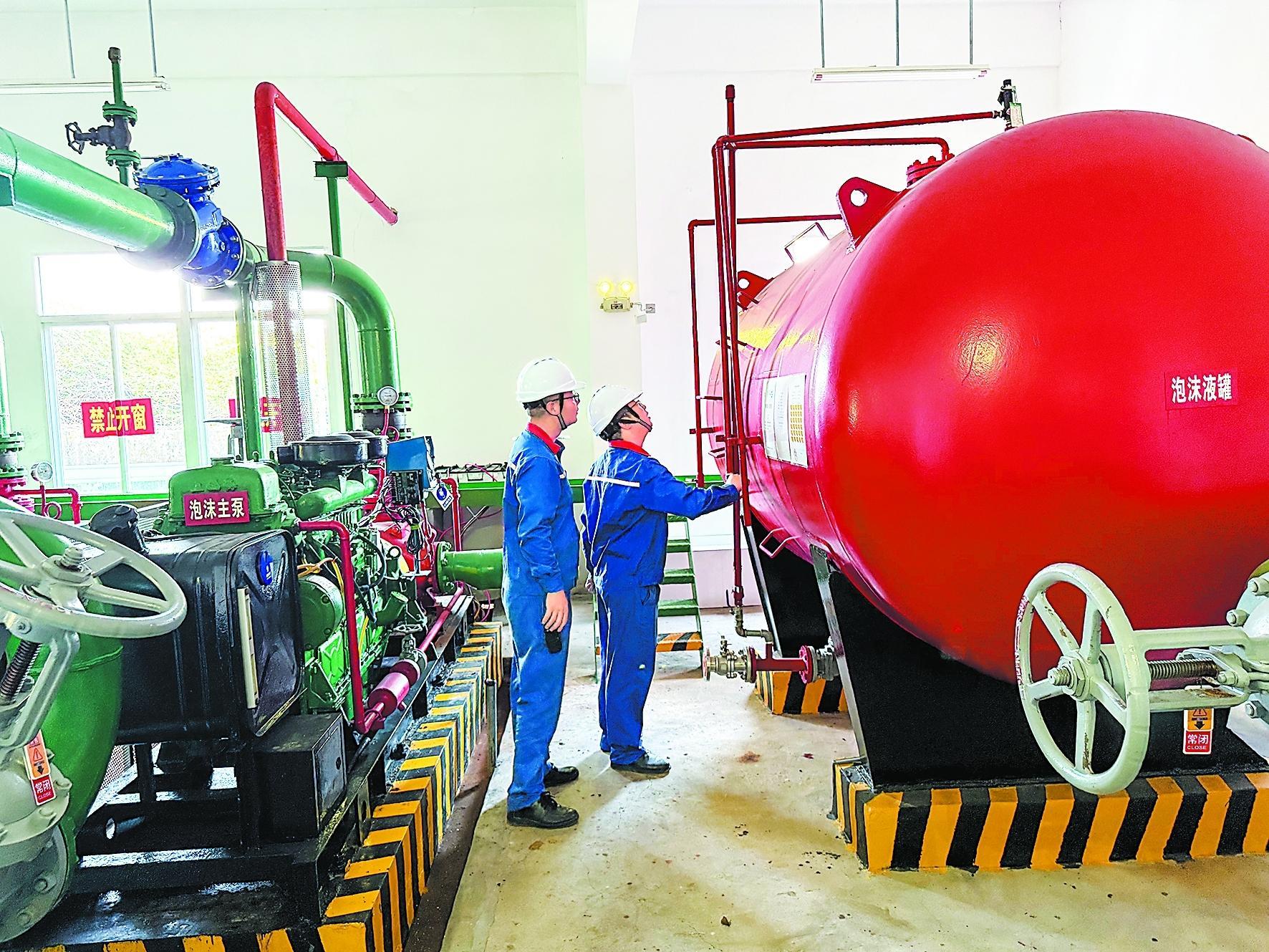福建石油深入开展安全隐患排查整治“雷霆行动”,强化全员隐患排查治理,确保库站冬季安全平稳运行。图为近日漳州石油铜陵油库组织员工对消防泡沫系统进行检查,确保设备状态良好。王鸿儒 摄