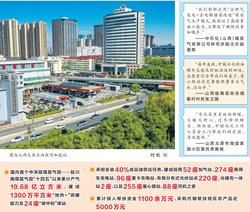 “十四五”以来,中国石化扎根三晋、勇担使命,全力扛稳央企责任担当,在保障能源安全、推动绿色转型、服务地方发展、增进民生福祉上不懈努力,与山西经济社会发展同频共振、同向而行,交出一份“保供有力、转型提速、创新引领、服务惠民”高质量发展新答卷,以实干担当助力谱写三晋大地推进中国式现代化新篇章。