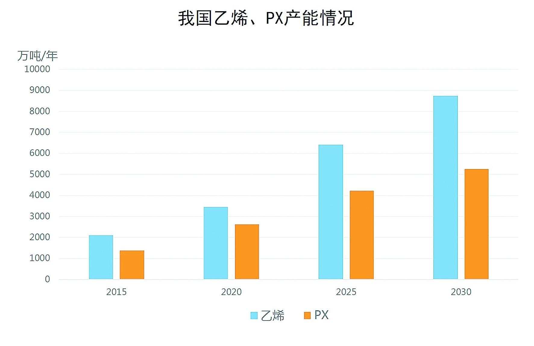 “十四五”期间,我国乙烯新增产能超2900万吨/年,PX(对二甲苯)新增产能约1600万吨/年。到2025年,我国乙烯产能规模增至6400万吨/年,PX产能规模增至4238万吨/年。“十五五”期间,预计乙烯和PX新增产能分别为2500万吨/年和950万吨/年。