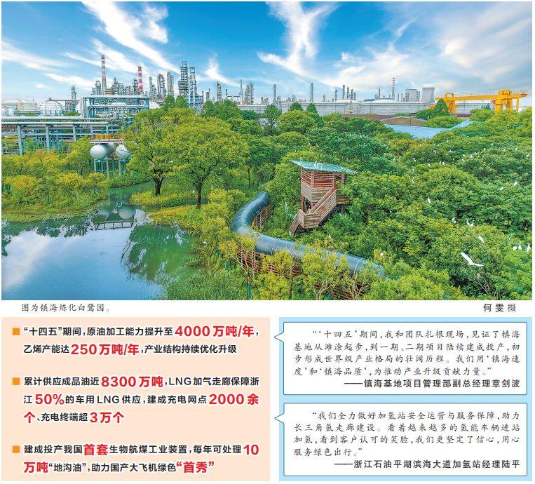 “十四五”以来,镇海炼化牢记习近平总书记殷切嘱托,聚焦打造“世界级、高科技、一体化”绿色石化基地,原油加工能力提升至4000万吨/年,乙烯产能达250万吨/年,产业结构持续优化升级。浙江石油近2100座加能站覆盖城乡各地,作为省内最大成品油销售企业,“十四五”期间累计供应成品油近8300万吨,LNG加气走廊保障浙江50%的车用LNG供应。宁波工程持续提升全业务链工程服务水平,先后完成镇海基地等多个重大石化项目建设,为提升浙江省石化产业竞争力贡献力量。燃料油浙江公司积极服务浙江沿海港口,为国际、国内船舶提供1.97万船次加注服务。天然气分公司浙江天然气销售中心全力拓展天然气产业链,服务范围覆盖10个地级市,累计供气近百亿立方米。