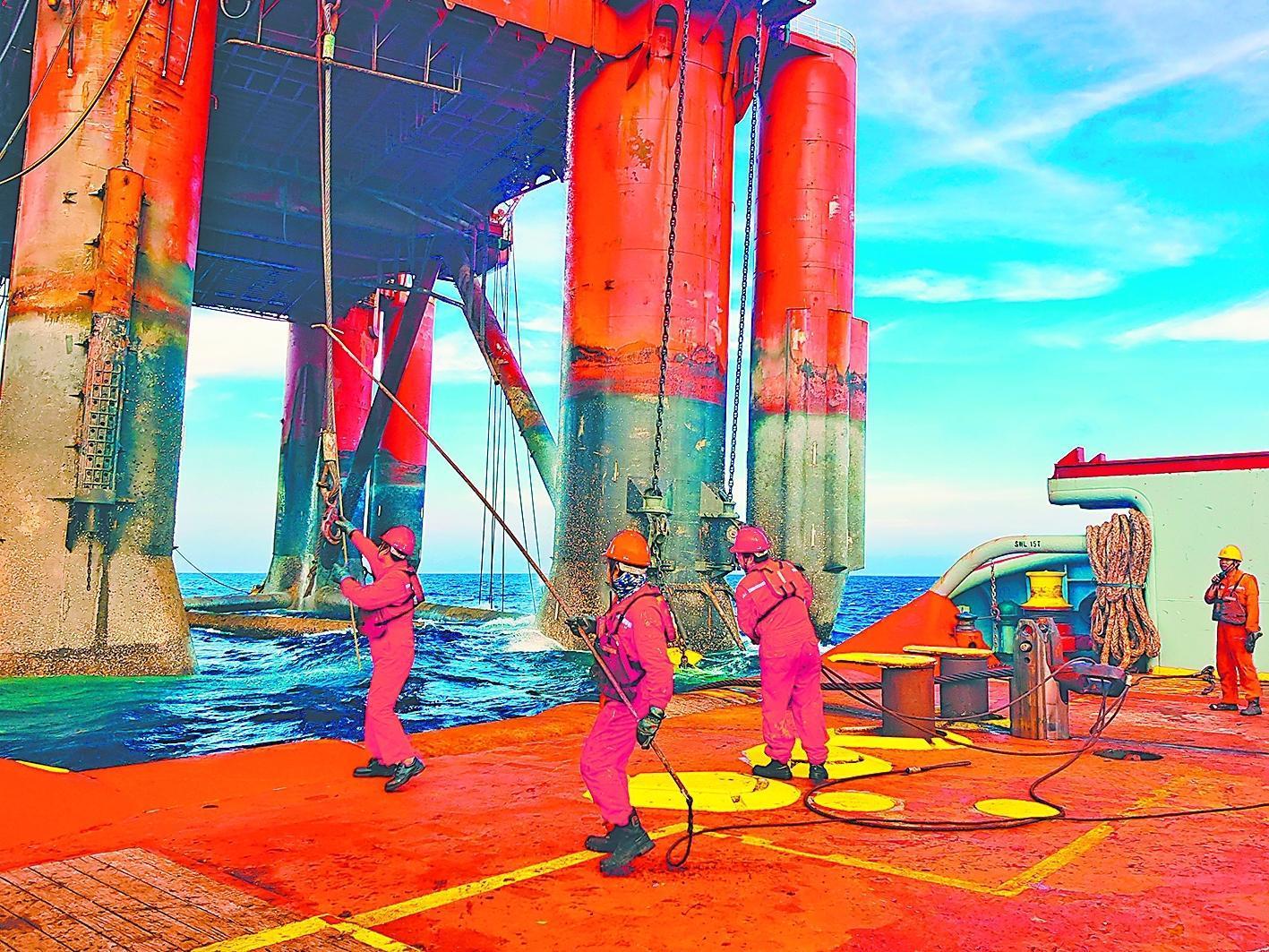 勘探225轮船员正在牵引平台锚头缆,准备连接至船舶钢缆。