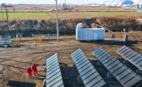 近日,胜利油田鲁胜公司鲁升采油管理区在王69-2井组成功投用多能耦合原油加热装置。该装置的“光热+空气源热泵+相变储能”系统,能够依据实际需求智能切换能源种类,与原先的电加热装置相比,日耗电量从576千瓦时降至174千瓦时,实现了能源智能互补与清洁利用。图为2025年12月25日,员工在现场查看多能耦合加热装置的应用情况。 本报记者 朱克民 摄 通讯员 陈军光 文