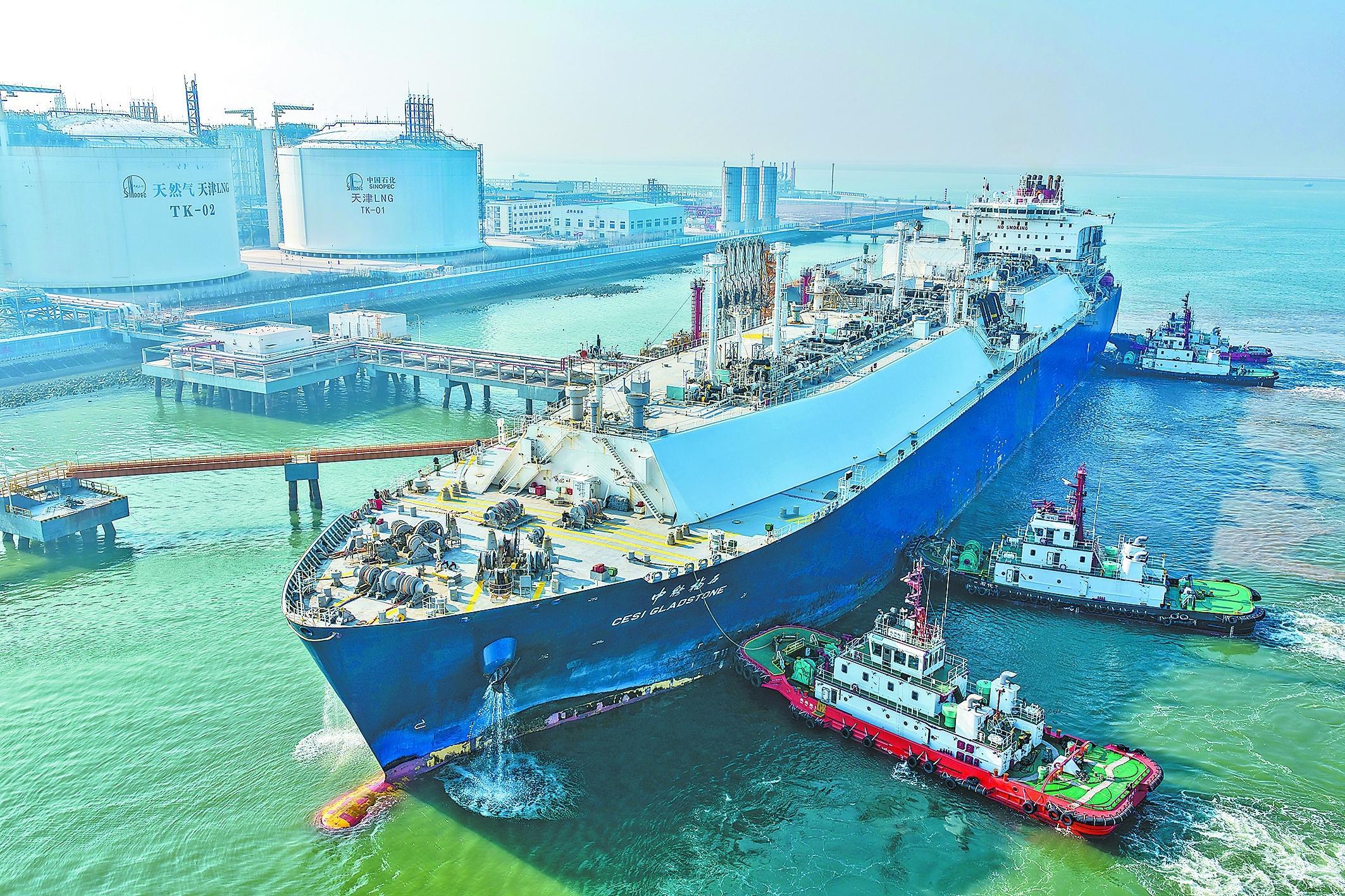 1月5日,满载约7万吨LNG的“中能福石”号LNG运输船靠泊天然气分公司天津LNG接收站,这是天津LNG接收站今年接卸的首船LNG。截至目前,该站累计接卸LNG超4200万吨,向京津冀地区供气超500亿立方米,持续保障华北地区民生用气。图为接卸现场。