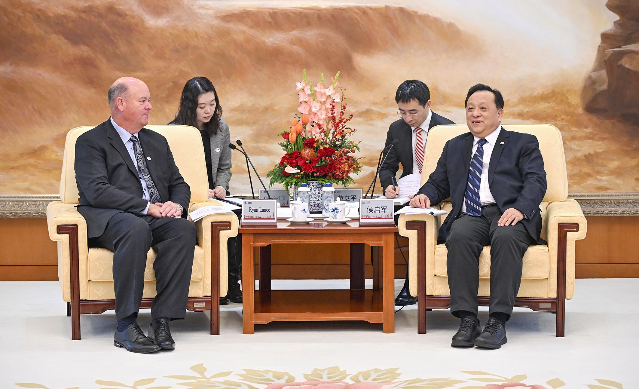 1月19日,集团公司董事长侯启军在总部会见康菲公司董事长兼首席执行官蓝睿谙,双方就深化在天然气一体化项目、石油贸易、工程服务等领域合作交换了意见。图为会见现场。