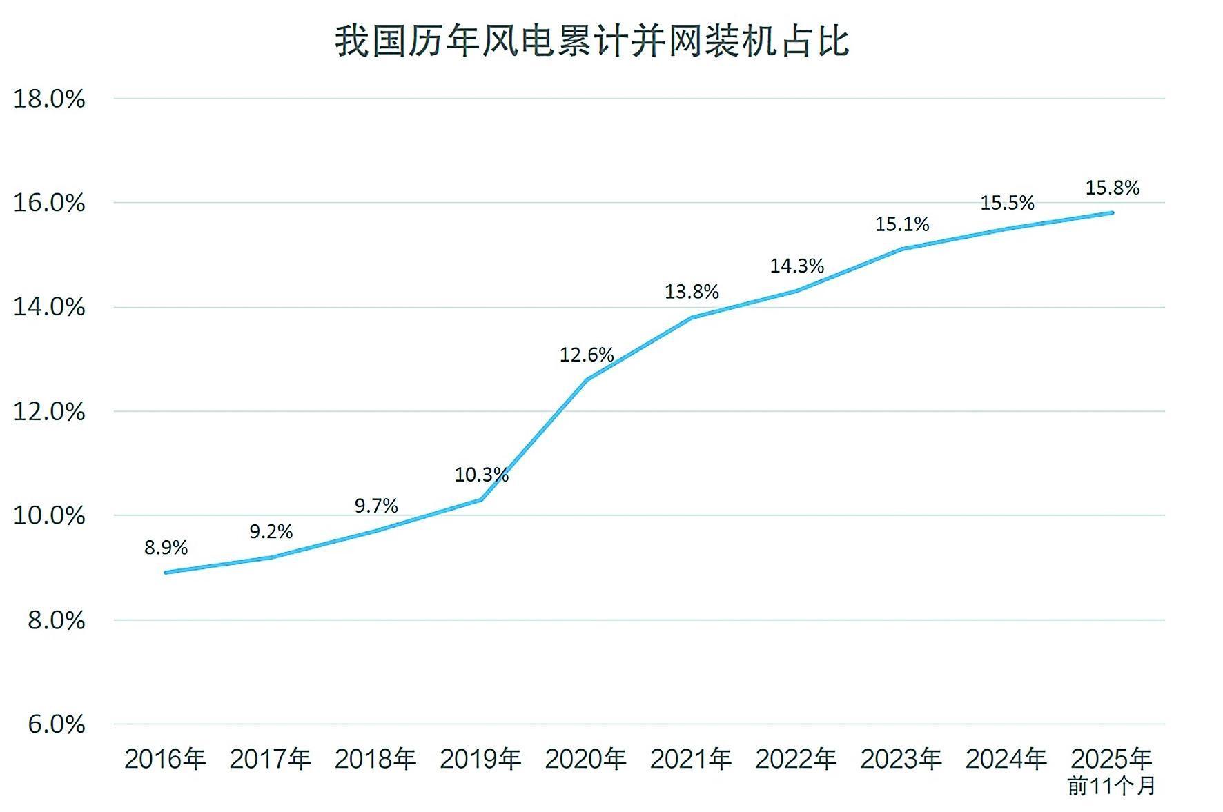 2024年7月,我国风电、太阳能发电累计装机容量达到12.1亿千瓦,提前6年实现了我国2020年12月在气候雄心峰会承诺的“到2030年,中国风电、太阳能发电总装机容量将达到12亿千瓦以上”目标。风电累计装机占比连续多年稳步提升,2024年底,我国全口径发电装机容量33.5亿千瓦,风电装机容量5.21亿千瓦,占比达15.5%。据国家能源局统计,2025年前11个月,全国累计发电装机容量37.9亿千瓦,其中风电装机容量6亿千瓦。