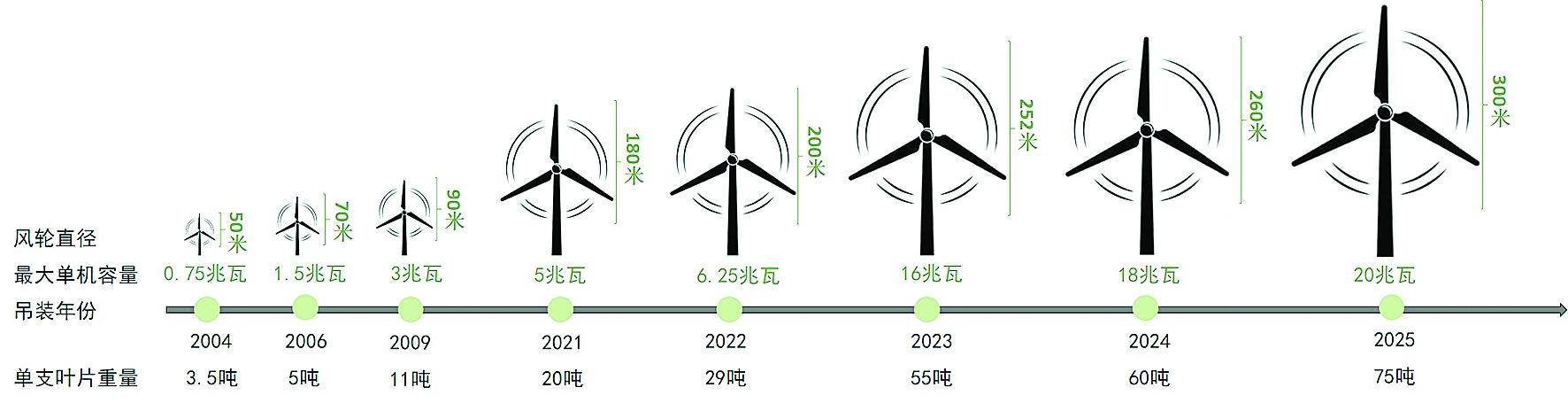 截至2025年底,我国已吊装机组中,海上风电机组风轮直径最大为300米,陆上风电机组风轮直径最大为270米。